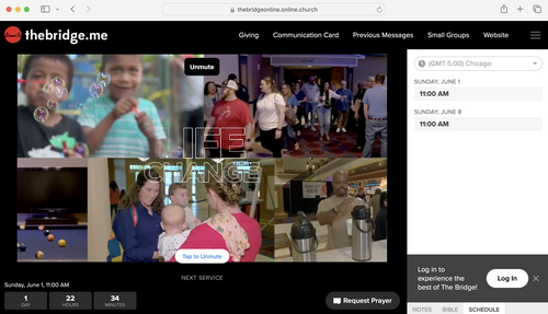 Watch at www.thebridge.me/live at 11 am on Sunday and cast to your TV. Or you can watch the live stream from our Roku/Apple TV App.