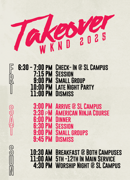 Takeover Weekend is an unforgettable experience for students in 5th–12th grade! The weekend will feature relevant and engaging teaching, high-energy worship, immersive and intentional environments, tons of fun, great food, friends, and so much more!